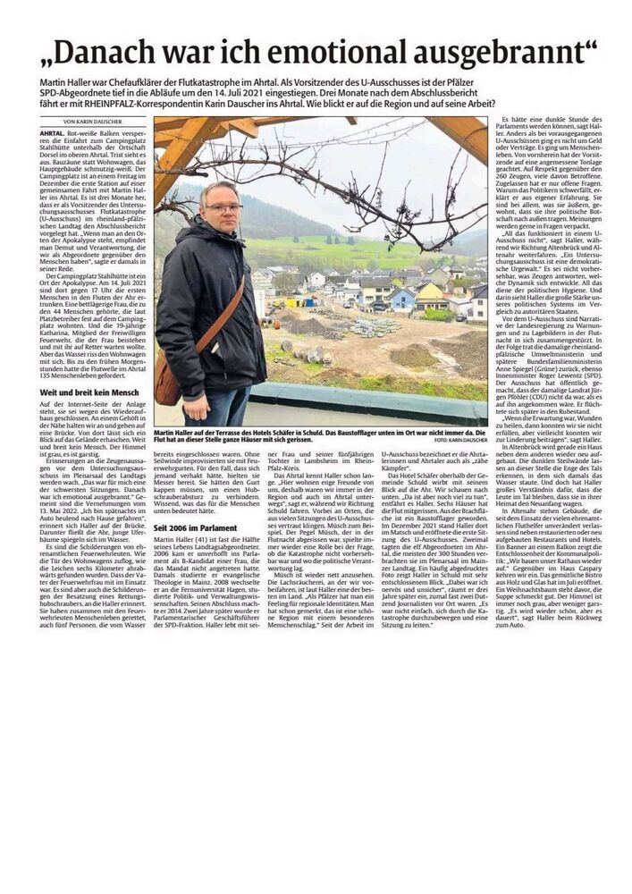 „Danach war ich emotional ausgebrannt“Martin Haller war Chefaufklärer der Flutkatastrophe im Ahrtal. Als Vorsitzender des U-Ausschusses ist der Pfälzer SPD-Abgeordnete tief in die Abläufe um den 14. Juli 2021 eingestiegen. Drei Monate nach dem Abschlussbericht fährt er mit RHEINPFALZ-Korrespondentin Karin Dauscher ins Ahrtal. Wie blickt er auf die Region und auf seine Arbeit? Der Campingplatz Stahlhütte ist ein Ort der Apokalypse. Am 14. Juli 2021 sind dort gegen 17 Uhr die ersten Menschen in den Fluten der Ahr ertrunken. Eine bettlägerige Frau, die zu den 44 Menschen gehörte, die laut Platzbetreiber fest auf dem Campingplatz wohnten. Und die 19-jährige Katharina, Mitglied der Freiwilligen Feuerwehr, die der Frau beistehen und mit ihr auf Retter warten wollte. Aber das Wasser riss den Wohnwagen mit sich. Bis zu den frühen Morgenstunden hatte die Flutwelle im Ahrtal 135 Menschenleben gefordert. Erinnerungen an die Zeugenaussagen vor dem Untersuchungsausschuss im Plenarsaal des Landtags werden wach. „Das war für mich eine der schwersten Sitzungen. Danach war ich emotional ausgebrannt.“ Gemeint sind die Vernehmungen vom 13. Mai 2022. „Ich bin spätnachts im Auto heulend nach Hause gefahren“, erinnert sich Haller auf der Brücke. Darunter fließt die Ahr, junge Uferbäume spiegeln sich im Wasser. Es sind die Schilderungen von ehrenamtlichen Feuerwehrleuten. Wie die Tür des Wohnwagens zuflog, wie die Leichen sechs Kilometer ahrabwärts gefunden wurden. Dass der Vater der Feuerwehrfrau mit im Einsatz war. Es sind aber auch die Schilderungen der Besatzung eines Rettungshubschraubers, an die Haller erinnert. Sie haben zusammen mit den Feuerwehrleuten Menschenleben gerettet, auch fünf Personen, die vom Wasser bereits eingeschlossen waren. Ohne Seilwinde improvisierten sie mit Feuerwehrgurten. Für den Fall, dass sich jemand verhakt hätte, hielten sie Messer bereit. Sie hätten den Gurt kappen müssen, um einen Hubschrauberabsturz zu verhindern. Wissend, was das für die Menschen unten bedeutet hätte. Das Ahrtal kennt Haller schon lange. „Hier wohnen enge Freunde von uns, deshalb waren wir immer in der Region und auch im Ahrtal unterwegs“, sagt er, während wir Richtung Schuld fahren. Vorbei an Orten, die aus vielen Sitzungen des U-Ausschusses vertraut klingen. Müsch zum Beispiel. Der Pegel Müsch, der in der Flutnacht abgerissen war, spielte immer wieder eine Rolle bei der Frage, ob die Katastrophe nicht vorhersehbar war und wo die politische Verantwortung lag. Müsch ist wieder nett anzusehen. Die Lachsräucherei, an der wir vorbeifahren, ist laut Haller eine der besten im Land. „Als Pfälzer hat man ein Feeling für regionale Identitäten. Man hat schon gemerkt, das ist eine schöne Region mit einem besonderen Menschenschlag.“ Seit der Arbeit im U-Ausschuss bezeichnet er die Ahrtalerinnen und Ahrtaler auch als „zähe Kämpfer“. Das Hotel Schäfer oberhalb der Gemeinde Schuld wirbt mit seinem Blick auf die Ahr. Wir schauen nach unten. „Da ist aber noch viel zu tun“, entfährt es Haller. Sechs Häuser hat die Flut mitgerissen. Aus der Brachfläche ist ein Baustofflager geworden. Im Dezember 2021 stand Haller dort im Matsch und eröffnete die erste Sitzung des U-Ausschusses. Zweimal tagten die elf Abgeordneten im Ahrtal, die meisten der 300 Stunden verbrachten sie im Plenarsaal im Mainzer Landtag. Ein häufig abgedrucktes Foto zeigt Haller in Schuld mit sehr entschlossenem Blick. „Dabei war ich nervös und unsicher“, räumt er drei Jahre später ein, zumal fast zwei Dutzend Journalisten vor Ort waren. „Es war nicht einfach, sich durch die Katastrophe durchzubewegen und eine Sitzung zu leiten.“ Es hätte eine dunkle Stunde des Parlaments werden können, sagt Haller. Anders als bei vorausgegangenen U-Ausschüssen ging es nicht um Geld oder Verträge. Es ging um Menschenleben. Von vornherein hat der Vorsitzende auf eine angemessene Tonlage geachtet. Auf Respekt gegenüber den 260 Zeugen, viele davon Betroffene. Zugelassen hat er nur offene Fragen. Warum das Politikern schwerfällt, erklärt er aus eigener Erfahrung. Sie sind bei allem, was sie äußern, gewohnt, dass sie ihre politische Botschaft nach außen tragen. Meinungen werden gerne in Fragen verpackt. „All das funktioniert in einem U-Ausschuss nicht“, sagt Haller, während wir Richtung Altenbrück und Altenahr weiterfahren. „Ein Untersuchungsausschuss ist eine demokratische Urgewalt.“ Es sei nicht vorhersehbar, was Zeugen antworten, welche Dynamik sich entwickle. All das diene der politischen Hygiene. Und darin sieht Haller die große Stärke unseres politischen Systems im Vergleich zu autoritären Staaten. Vor dem U-Ausschuss sind Narrative der Landesregierung zu Warnungen und zu Lagebildern in der Flutnacht in sich zusammengestürzt. In der Folge trat die damalige rheinland-pfälzische Umweltministerin und spätere Bundesfamilienministerin Anne Spiegel (Grüne) zurück, ebenso Innenminister Roger Lewentz (SPD). Der Ausschuss hat öffentlich gemacht, dass der damalige Landrat Jürgen Pföhler (CDU) nicht da war, als es auf ihn angekommen wäre. Er flüchtete sich später in den Ruhestand. „Wenn die Erwartung war, Wunden zu heilen, dann konnten wir sie nicht erfüllen, aber vielleicht konnten wir zur Linderung beitragen“, sagt Haller. In Altenbrück wird gerade ein Haus neben dem anderen wieder neu aufgebaut. Die dunklen Steilwände lassen an dieser Stelle die Enge des Tals erkennen, in dem sich damals das Wasser staute. Und doch hat Haller großes Verständnis dafür, dass die Leute im Tal bleiben, dass sie in ihrer Heimat den Neuanfang wagen. In Altenahr stehen Gebäude, die seit dem Einsatz der vielen ehrenamtlichen Fluthelfer unverändert verlassen sind neben restaurierten oder neu aufgebauten Restaurants und Hotels. Ein Banner an einem Balkon zeigt die Entschlossenheit der Kommunalpolitik: „Wir bauen unser Rathaus wieder auf.“ Gegenüber im Haus Caspary kehren wir ein. Das
