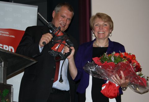 Unterbezirksvorsitzender Martin Wegner gratulierte Doris Barnett mit Blumen und einer Schlagbohrmaschine „zum Bohren dicker Bretter“.